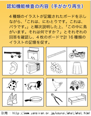 一定のイラストを記憶し、採点には関係しない課題を行った後、記憶しているイラストをヒントなしに回答し、さらにヒントをもとに回答します。