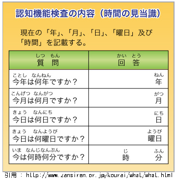 認知機能検査は、検査員の説明を受けながら、検査用紙に受検者が記入して行います。 検査では、次の3つの検査項目によって、受検者の記憶力や判断力の判定をします。